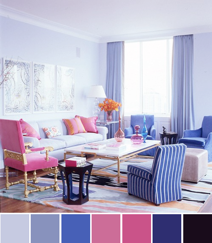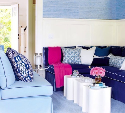So I’m all about blues, but I rarely think to mix shades — this room though is inspiring me to do just that, especially since navy is my favorite and right now we’re working with a rug with a pattern that’s a slightly lighter blue. The pop of pink is nice in a non-commital way.