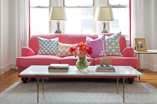 A hot pink couch is a bold move, but it works and doesn’t feel too trendy or girly here.