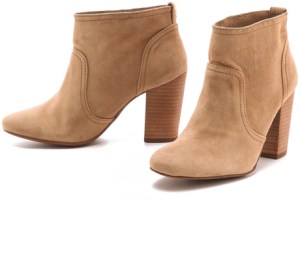 I’ve been craving a pair of tan suede ankle booties for awhile now — actually since last fall, when I should have picked up a pair. I’ve been holding off on buying them because I already have a pair of black ankle-boots and a pair of gray oxford-like booties, but now that I’m working in a more casual office, I’m really feeling the need for a more casual pair of tan booties to dress down my skirts and dresses or to give me some height with jeans.