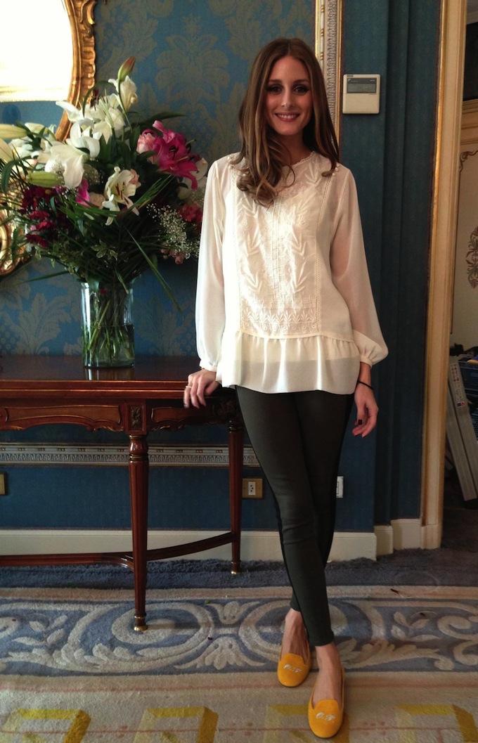 Olivia Palermo has that unique ability to mix unexpected pieces that you would never think would go together in a way that looks impossibly chic. Case in point: Her latest blend of emerald racer-stripe skinnies, a feminine, slightly bohemian cream blouse, and a preppy pair of yellow monogrammed smoking slippers. The sporty + boho + preppy mash-up couldn’t feel more effortless or look more stylish, and she makes a good case for experimenting more with blends of different styles.