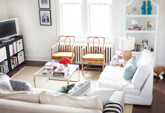 I’ve been trying to come up with stylish ways to add character to our small Manhattan rental while also finding creative ways to store all of our stuff. Our problem isn’t so much that our space is too small to fit all our stuff — it’s that we don’t have enough furniture — or as I like to remind the fiance, the right furniture — to fill out the space and house all of our smaller crap so the apartment ends up looking a little undecorated and empty. It’s a cool layout that could be used as one big open space or divided into a living room and dining room area or even three areas if we wanted to separate the office, and there’s lot’s of fun nooks and crannies. I am pretty sure the biggest issue is that our loveseat, which was a good idea when we lived in a much smaller, narrower apartment, is too small as the main seating option, but it could just be a matter of reworking the layout. I love the comfort of a sectional, but while we save up for an “adult” (read: nice) one that doesn’t scream sectional, I’m getting inspired by these stylish apartments that center around smaller couches like our own classic, nondescript white one.